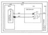 FIG. 2 illustrates a typical arrangement for an ECU101-105 with a classical CAN-controller. Non-relevant aspects of such a device are omitted for clarity such as power-supply, digital and analog IOs, filters, and connectors. The external CAN-bus204 has adrop line205 to the CAN-driver201. This CAN-driver201 in this example is an integrated circuit typically molded into SO8 device with 8 pins. Two of those eight pins are connected to the receive signals from CANH and CANL from the twistedpair drop line205. The CAN-driver201 performs a number of different electrical functions including keeping CANH and CANL at 2.5 Volt. This control voltage has high output impedance so it is easy for other devices to change the level from 2.5 Volt to other levels with a relative small current. Thecircuitry203 is the input part of the CAN-driver that will compare the voltage level of CANH relative to CANL. The state where CANH is less than 0.5 Volt higher than CANL is defined as recessive bus represented on the reception (RX)-pin207 with a high voltage, typically 5 or 3.3 Volt, and this level is defined as logical 1. This digital signal is connected to the CAN-controller210, which in this case is a function integrated into the MCU (Micro Controller Unit). There are several hundred different MCUs with CAN controllers available on the market with different size in memory like SRAM and Flash and with different type of IOs to control different types of actuators and read different types of sensors. In most cases an MCU with integrated CAN-controller is used, but in some cases is it not possible to find an MCU with all functionality needed in combination with an integrated CAN-controller. In such cases, an external CAN-controller, like SJA1000 or a MCP2515, can be used, but the location of the CAN-controller relative to the MCU or any other logic makes no difference for application of the described subject matter as long as the device connected to the described filter or bridge generally complies with the rules defined by the CAN-protocol.