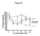 FIG. 8C is a curve fit analysis of the data fromFIGS. 8A and 8B. Antibody G1 or vehicle was administered intravenously (i.v.) either 24 hours or 7 days before nerve electrical pulse stimulation. Y axis represents total AUC. X axis represents varying doses of antibody G1 in “mg/kg” on a logarithmic scale to determine EC50.