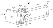 Thelabel holder2712 may comprise adisplay plate2716 that has afront surface2718 and aback surface2720. In one example, thefront surface2718 of thedisplay plate2716 may be configured to receive a display label (not shown inFIG. 27). Accordingly, in one example, this display label may be configured to communicate product information (e.g. a product name, price, and the like) to a customer in a store, and the like. Thelabel holder2712 may also comprise anarm structure2722 that is coupled to theback surface2720 of thedisplay plate2718. As will be discussed in further detail below, thearm structure2722 may comprise a geometry that prevents more than one product from being removed from thelower rail2706 as thelabel holder2712 is pivoted from a closed position, as depicted inFIG. 27, to an open position, as depicted inFIG. 28C. As such, thearm structure2722 may comprise alower bumper surface2730 spaced apart from anupper bumper surface2732 to form achannel2806 therebetween. In one example, thelabel holder2712 may be formed from one or more injection molding processes of one or more polymer materials. Additionally or alternatively, thelabel holder2712 may be wholly or partially formed from one or more metals or alloys.