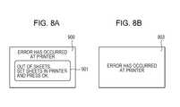 In S413, theCPU103 has only acquired information from the advertising information to the effect that an error has occurred at thecommunication device151, so only an error overview display such as illustrated inFIG. 8B is performed on the display screen of the printing app displayed on thedisplay unit108. In the error overview display, only notification that some sort of error has occurred at thecommunication device151 is displayed in a display region. Alternatively, an arrangement can be made where theCPU103 quits the flow without notifying the user.