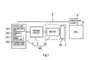 The drivingcircuit2 includes a pulse-width modulation (PWM) signal generating unit and a driver (none of which are illustrated). The PWM signal generating unit generates a PWM signal in which the duty cycle is adjusted in such a manner that the rotational speed of themotor1A corresponds to a target speed that is input from thecontrol unit3, and outputs the PWM signal to the driver. The driver causes current to flow into the coil of themotor1A on the basis of the PWM signal, thereby rotatably driving themotor1A. That is, by variable duty cycle control, the drivingcircuit2 changes the rotational speed of themotor1A.