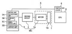 Thetemperature sensor4 is a sensor that detects the temperature of theCPU6. Thetemperature control unit3D generates the target speed in such a manner that the detection temperature detected by thetemperature sensor4 corresponds to a target temperature, and outputs the target speed to thedriving circuit2. Specifically, if the detection temperature becomes higher than the target temperature, thetemperature control unit3D increases the target speed to increase the rotational speed of themotor1A. If the detection temperature becomes lower than the target temperature, thetemperature control unit3D decreases the target speed to decrease the rotational speed of themotor1A. Thus, cooling control is performed on theCPU6, and the temperature of theCPU6 is controlled to be constant.