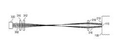 Referring now toFIGS. 1 and 3, one embodiment for separating atransparent workpiece130 includes an initial step of forming acontour line110 on the surface of theglass workpiece130. Thecontour line110 defines the intended line of separation and generally includes defects which, when further operated on such as by heating or the like, cause spontaneous separation of thetransparent workpiece130 along thecontour line110. In a second step following forming of thecontour line110, anannular laser beam210 from an infrared laser is directed onto the surface of theglass workpiece130 along the contour line. In embodiments, theannular laser beam210 may be formed by directing an initial Gaussian-shaped beam of, for example, a CO2laser through anaxicon lens310, a first plano-convex lens312, and a second plano-convex lens314 as depicted inFIG. 3 to facilitate shaping the Gaussian-shaped beam into a Bessel beam having a beam spot with an annular profile as depicted inFIG. 1 and an annular energy distribution as depicted inFIG. 2. In the embodiment of the separation process depicted inFIG. 1, the resultantannular laser beam210 has a profile which is generally circular symmetric (i.e., an annulus or ring).