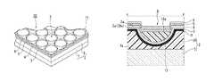 Thereflective layer3 is provided in each of theunit regions11. Thereflective layer3 is formed in the light emitting area U in each of theunit regions11. Thereflective layer3 is formed on anupper face8aof thelight absorption layer8 including inner faces of the plurality of recessedportions9. Thereflective layer3 may be formed continuously over the plurality of recessedportions9 or discontinuously in each of the recessedportions9. A metal having high reflectance such as aluminum or silver is preferably used as a material constituting thereflective layer3. In the case of the present embodiment, thereflective layer3 is formed from, for example, an aluminum film having a film thickness of 100 nm.