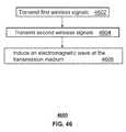 FIG. 46 illustrates a flow diagram of an example, non-limiting embodiment of amethod4600 for sending and/or receiving electromagnetic waves representative of communications. At4602, a communication device can utilize an antenna array to transmit first wireless signals that are associated with communication signals. The first wireless signals can be directed via beam steering by the antenna array towards a wireless receiver of another communication device. The communication signals can represent various types of information, including control information, voice, video, data, messaging, and so forth. At4604, the communication device can transmit second wireless signals associated with the communication signals. The second wireless signals can be directed via the beam steering by the antenna array towards a transmission medium, such as a power line. The first and second wireless signals can be transmitted at a same time or in temporal proximity to each other.