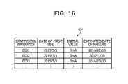 Thelife calculation unit622 identifies a date based on the date of first use extracted from the life table634 and the calculated life τ as an estimated date of failure. Thelife calculation unit622 then updates an estimated date of failure in the life table634 associated with the obtainedidentification information632 using the identified estimated date of failure (S312). Thedetermination unit620 performs the processing in operation S300 again.