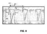 FIG. 8 illustrates continuous wave Doppler signals identifying features used in blood flow monitoring.
