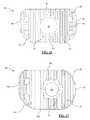 FIGS. 32 and 33 illustrate one example of aloading block200, which can be used for assisting in the attachment of a tubularcore attachment feature35 of an endplate to theendplate attachment feature22,42 of acore expanding body12 orextension piece150. By way of example only,loading block200 includes afirst side201, asecond side202, atop face207, and abottom face203. Additionally,loading block200 includesendplate profile trenches205 which consist of acenter post204, abase210, andgutters206. Theendplate profile trenches205, along with the center posts204, serve as positioning guides for when the endplate is loaded, and for once the endplate is positioned in theloading block200. By way of example, the center post, which passes through thelarge center hole62 of the endplate, and the walls of theendplate profile trench205 both provide a generally sliding fit to thecenter hole62 and outer profile of the endplate being loaded into theloading block200. Different dimensions are available for the profiles of theendplate profile trenches205 andcenter posts204 such that each available endplate previously mentioned has acenter post204 and encompassingendplate profile trench205 that corresponds to its size and shape, and, thus, can facilitate in providing secure positioning during assembly of the endplate. Additionally, the profile shapes of theendplate profile trenches205 are shaped to accommodate all endplate shapes, both previously mentioned (e.g. rectangular, circular) and a range of variations.