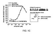 FIG. 1A-FIG. 1C show the chemically induced dimerization of CD40.FIG. 1A is a schematic of endogenous CD40.FIG. 1B is a schematic of a Chemically Induced Dimerization System (CID) that utilizes a lipid-permeable organic dimerizer drug (AP20187) that binds with high affinity to drug binding domains.FIG. 1C provides a graph, a photograph of a Western blotl, and a schematic of a DNA construct for an NFκB-SEAP Reporter Assay in Jurkat TAg Cells.