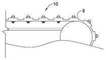 Turning now toFIGS. 6athrough 6d, alternative embodiments of wear resistant studs are illustrated. In particular, as illustrated inFIG. 6a, the wearresistant studs10 may be passed through a t-bar70 formed of first and second channel sections,72 and74, respectively. As illustrated inFIG. 15, thefirst channel section72 may be aligned with a lengthwise direction of thetrack8 wherein thesecond channel section74 may be transverse to thetrack8. Furthermore, abar claw76 may be formed with thetop member14 being formed by aperpendicular bar78 extending between a pair of threadedmembers12 as illustrated inFIG. 6bwherein thebar claw76 may be positioned transverse or angularly relative to thetrack8 as illustrated inFIG. 15. As illustrated inFIG. 6c, a v-shapedclaw80 may be also be formed with the top member formed in atriangular shape82. It will be appreciated that although a triangular shape is illustrated for the v-shaped claw, any other shape such as, by way of non-limiting example, circular, rectangular or irregular may also be utilized. Although the v-shapedclaw80 is illustrated inFIG. 15 as having the threadedmembers12 longitudinally along the track, it will be appreciated that other orientations such as transverse or diagonal on the track may also be utilized.
