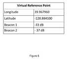 Referring toFIG. 6, an illustrative VRP is shown. The VRP comprises a longitude value and a latitude value indicating the location of the VRP. The VRP further comprises a signal identifier and an RSSI for each beacon associated with the premises. For example, in the illustrative VRP shown, the signal identifier is “Beacon1” and the RSSI corresponding toBeacon1 is −33 dB.