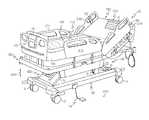 In embodiments, theupper frame102 includes anend rail71 proximate thefoot end120 and anend rail72 proximate thehead end122, and side rails73,74 disposed between and coupled to theend rail71 and theend rail72. Theupper frame102 includes cable tie locking mounts81 and upper pivot projection features90 that project fromside rails73,74. Similarly, thebase frame101 includes an end rail61 proximate thefoot end120 and anend rail62 proximate thehead end122, and sides rails63,64 disposed between and coupled to the end rail61 and theend rail62. In embodiments, thebase frame101 further includes one or more sensors for detecting and determining a load applied to theperson support apparatus10 such as, for example, the weight of a person positioned on theperson support apparatus10. In embodiments, the one or more sensors may include load beams (not shown) disposed within the side rails63,64 of thebase frame101. In other embodiments, the one or more sensors may include load cells (not shown) disposed within the side rails63,64 of thebase frame101. The one or more sensors may be communicatively coupled to acontrol box24 of theperson support apparatus10, either by wires or wirelessly, and transmit a signal to the control box indicative of the weight of a person positioned on theperson support apparatus10. Thebase frame101 may also include an angular orientation sensor, such as an inclinometer I, attached to or integrated in one of the side rails63,64. The inclinometer I may be communicatively coupled to acontrol box24 of theperson support apparatus10, either by wires or wirelessly, and transmits a signal to thecontrol box24 indicative of the angular orientation of theperson support apparatus10 with respect to horizontal level.