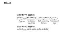 Example 2. The Design and Synthesis of NFP1 and NFP2NFP1 and NFP2 nanofibers are composed of multiple peptides, wherein each peptide contains a self-assembling domain having the sequence KLDLKLDLKLDLK (SEQ ID NO: 1). Further, each individual peptide was conjugated to a 2 kDa mPEG polymer at its N-terminus and a FITC fluorophore at its C-terminus. The amino acid sequences of the NFP1 and NFP2 peptide constructs are shown inFIG. 2A. The peptide constructs could self-assemble into nanofibers in PBS.