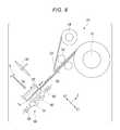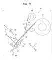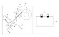 Thecutter56 cuts the belt-like tape T supplied from the unwindingunit51 and forms a tape T having a predetermined size. For example, thecutter56 is a rotor cutter and includes acutting blade56aand a supportingshaft56b. The supportingshaft56bis rotated by a not-shown motor, whereby thecutting blade56ais driven to rotate. Note that the configuration of thecutter56 is not limited to the above example. The configuration of thecutter56 may be any configuration as long as thecutter56 can cut the tape T supplied from the unwindingunit51. Thecutter56 is capable of moving, with a not-shown moving mechanism, in a direction toward the tape T and a direction away from the tape T.