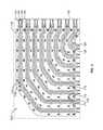 FIG. 3 is a perspective view of a portion of one of thecontact modules122 showing thesignal contacts124 and guard traces136. Thesignal contacts124 and guard traces136 are arranged in an array in acontact plane138. The guard traces136 are arranged betweencorresponding signal contacts124, such as betweenpairs140 of thesignal contacts124. The guard traces136 form part of theshield structure126. The guard traces136 are configured to be electrically connected to the first and second ground shields180,182 by the ground skewers184 (shown inFIG. 2). The guard traces136 provide electrical shielding between thesignal contacts124, such as between thepairs140 of thesignal contacts124. In other various embodiments, thecontact module122 may be provided without the guard traces136 between thesignal contacts124.