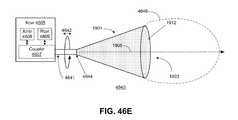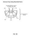 The hollow-boresightantenna beam pattern4606 has major lobes at angular deviations of AO from thelongitudinal axis1905 of thedielectric antenna1901 and has a null in a direction corresponding to thelongitudinal axis1905. Particularly, the null in the hollow-boresightantenna beam pattern4606 has a relatively low field strength in a direction corresponding to thelongitudinal axis1905 of thedielectric antenna1901 compared with directions that deviate from the direction corresponding to thelongitudinal axis1905. While the hollow-boresightantenna beam pattern4606 is shown in two dimensions, the hollow-boresightantenna beam pattern4606 has a three-dimensional shape. Consider the case shown where thedielectric antenna1901 has a circular conical cross section and is symmetrical about thelongitudinal axis1905. In this case, the three-dimensional shape of the hollow-boresightantenna beam pattern4606 is azimuthally symmetrical about thelongitudinal axis1905.