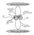 FIG. 2 shows a schematic representation of an optical antenna (e.g., nanoantenna, or nanoantenna device)200, according to various embodiments, illustrating luminescence enhancement, for example as a result of enhancement of an optical emission of one or more light sources. Theoptical antenna200 may enhance the luminescence signal of localized light sources (represented as210 for two such localized light sources) in the direction perpendicular to its plane (represented by the dashed box206). The optical antenna (nanoantenna)200 may include a plurality of nanoparticles (represented as202 for two such nanoparticles), for example, dielectric nanoparticles which may act as dielectric nanoantennas. Theplane206 of thenanoparticles202, and overall of thenanoantenna200, may be defined as the plane at which thenanoparticles202 or thenanoantenna structure200 is fabricated, e.g., the plane of the substrate (not shown) where thenanoparticles202 or thenanoantenna structure200 is located.