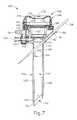 FIG. 7 depicts a side sectional view of the trocar ofFIG. 5, showing an exemplary suture needle passer extending through the trocar along an exemplary first suture path oriented obliquely relative to a central axis of the trocar;