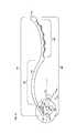 FIGS. 58-59 illustrate an eye-level view of thebottom side345 of asafety razor105 for two-point discrimination according to an embodiment where ablade group265 has asharp blade115 and aninner guard135 parallel to thesharp blade115 on a trailing side of thesharp blade115 opposite theouter comb145 wherein anouter comb145 parallel to thesharp blade115 on a leading side of thesharp blade115 and asubstrate structure215 having agroove305 and adapted to hold theblade group265 and a support on thefront surface375 of thesubstrate structure215 opposite arear surface385. InFIGS. 58-39 theblade group265 having aleft attachment side545 and aright attachment side555 wherein theleft attachment side545 is opposite theright attachment side555 and a user's hand, which is illustrated with a dashed line, is removably holding theright attachment side555 and sliding saidblade group265 along asubstrate structure215 and towards a safety razor leftside505 of theblade group265 and is sliding theblade group265 into thegroove305. In the illustration inFIGS. 58-39 thegroove305 ofsubstrate structure215 having atrack705 while ablade group265 having atrack attachment slot715 close to thebottom side605 of theblade group265 which may have an opening in order for thetrack705 to insert into thetrack attachment slot715 while abottom side605 opposite atop side595 of theblade group265 is entering thegroove305 from the safety razorright side515 opposite a safety razor leftside505.Track attachment slot715 may have a track attachmentsecondary slot725 as illustrated inFIGS. 58-59. Theblade group265top side595 is opposite thebottom side605 and thetop side595 is a portion of theblade group265 touching a skin surface of a user during a shaving stroke during two-point discrimination. The length of theblade group265 or asupport275 referenced as support length575 is the length of theblade group265 orsupport275 inside of theleft attachment side545 and theright attachment side555. The length of the support length575 is about 36.322 millimeters or greater. A preferred support length575 is about 72.644 millimeters.