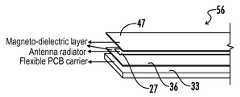 In each of the embodiments shown inFIGS. 2-4, the presence of an MD layer enhances EM energy radiation by lowering the EM energy concentrated on theflexible PCB carrier33, thereby permitting an increase in antenna gain and a reduction in the size of the antenna structures and, specifically, theradiator27 for a given level of antenna performance. Indeed, the MD layer can lead to antenna miniaturization by a factor of the refractive index (n=(μrεr)0.5).