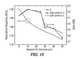 FIG. 9A is a graph illustrating simulated resonance frequency and antenna gain for a range of magnetic film thickness in an embedded structure.