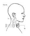 Thevagus nerve60 is identified inFIG. 7, along with thecarotid sheath61 that is identified there in bold peripheral outline. The carotid sheath encloses not only the vagus nerve, but also the internaljugular vein62 and the commoncarotid artery63. Features that may be identified near the surface of the neck include the externaljugular vein64 and thesternocleidomastoid muscle65. Additional organs in the vicinity of the vagus nerve include thetrachea66,thyroid gland67,esophagus68, scalenusanterior muscle69, andscalenus medius muscle70. The sixthcervical vertebra76 is also shown inFIG. 7, with bony structure indicated by hatching marks.