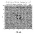 FIG. 46E is a graphical diagram4617 illustrating, example, non-limiting embodiments of a property of an electromagnetic wave having a cylindrical scattering wave mode in accordance with various aspects described herein. In particular, the real part of the θ or azimuthal angle component of {right arrow over (E)}, of an incident wave, Re (Eiθ), is presented in the x-y plane. As shown, Re (Eiθ) also has positive and negative peaks near the region corresponding to the position of wire surface and extends outward in a spiraling ripple pattern consistent with a cylindrical wave.