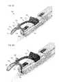 It should be also be appreciated that in some instances the delivery device (1200) may be temporarily configured to prevent advancement of the plunger (1206) between the retracted position shown inFIGS. 12A-12D and the extended position shown inFIGS. 12E and 12G. In some variations, the delivery device (1200) may comprise an intermediate stop, which may temporarily limit advancement of the plunger (1206) between the retracted and extended positions. For example,FIGS. 13A-13D depict a variation of the cannula (1202) of the delivery device (1200) ofFIGS. 12A-12I with the plunger (1206) and tongue (1204) removed. As shown there, the cannula (1202) may comprise a bumper plate (1300). The bumper plate (1300) may be moveable between a lowered position (as shown in rear and front perspective views inFIGS. 13A and 13C) and a raised position (as shown in rear and front perspective views inFIGS. 13B and 13D). When the bumper plate (1300) is in the lowered position, the bumper plate (1300) may block advancement of the plunger (1206) to the extended position shown inFIGS. 12E and 12G. For example, the plunger (1206) may be advanced with the bumper plate (1300) in the lower position until the stopper portion (1230) reaches and contacts the bumper plate (1300). The engagement between the stopper portion (1230) and the bumper plate (1300) may temporarily prevent further advancement of the plunger (1206) relative to the cannula (1202). Conversely, when the bumper plate (1300) is in the raised position, the stopper portion (1230) may pass under the bumper plate (1300) and may allow the plunger (1206) to be advanced to the extended position.