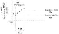 Referring toFIG. 12, when afirst change point220 from the start of the observation process is detected, the count of observed incomplete TCP/IP sessions may become aninitial baseline value221, b0, for subsequent measurements. It should be appreciated that methods other than selection of a value corresponding to thefirst change point220 may be used for establishing an initial baseline value. The approach described herein is exemplary and could be replaced by setting a fixed initial baseline value, taking an average value of the data collection intervals prior to thefirst change point220, and/or other methods.