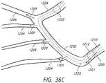 InFIG. 36C, blood flow is allowed through theexpandable member1212, as shown by thearrow1201, but theinflatable member1212 inhibits normal blood flow in the deep plantarvenous arch1202. Pressure due to the restricted flow builds up in the deep plantarvenous arch1202. The pressure buildup, optionally in combination with the flow of blood from the lateralplantar vein1200, can causes reversal of blood flow into themetatarsal veins1204, as shown by thearrows1209.
