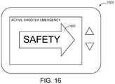 More particularly, in the example ofFIG. 16, theprocessing circuit610 of thedisplay device402 may receive, via thecommunications interface602, a first indication of a first location of a shooter from a shot detection system. The shot detection system may be included with thebuilding emergency sensors406 and may be configured to detect a gunshot in the building and determine a location of the gunshot in the building. Theprocessing circuit610 may determine and escape route, an evacuation route, or other route to safety based on the first location of the shooter, the location of thedisplay device402, and the location of one or more additional display devices (e.g.,display device416, display device418), and a floor plan of the building, A first navigation direction may be displayed on the display device410 (e.g., as shown inFIG. 16) to direct a user along a route that avoids the shooter within the building. A second navigation direction may be displayed on a second display device (e.g.,display device416, display device418) to show a user a next step on the safe route to avoid the shooter.
