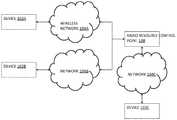 In embodiments, radioresource control point108 may comprise a computing device, such as an application-specific integrated circuit (ASIC), a field programmable gate array (FPGA), a server, a router, a wireless router, a switch, a gateway, a border controller, a hub or some other computing device. In embodiments, the radioresource control point108 may be enabled to track a plurality ofuser devices102A-C. In embodiments, the radioresource control point108 may be associated with a plurality ofnetworks104A-C.