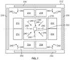 FIG. 6 illustrates a schematic cross-sectional top view of another example of a portion of the example implementation of theserver tray package200 that includes the liquidcold plate assembly201. In this example implementation,flow circuits272 and282 are formed in a surface of the bottom228 of thetop hat222. In this example, theflow circuits272 are formed byridges270 formed in the surface of the bottom228, and theflow circuits282 are formed byridges280 formed in the surface of the bottom228. Alternatively, thecircuits272 and282 may be formed as troughs embedded in the surface of the bottom228. As shown in this example, flowcircuits272 are more closely spaced (e.g., a higher pitch) relative to theflow circuits282. Also, as shown, theflow circuits272 are formed in theheat transfer area250 above portions of the bottom228 that are vertically aboveonly memory modules214 on theinterposer212. Theflow circuits282 are formed in theheat transfer area250 above portions of the bottom228 that are vertically abovememory modules214 and theprocessing device216 on theinterposer212.