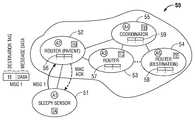 InFIG. 4C,coordinator55 is in receipt ofmessage2.Routers52,53,54, and55 include source address maps56,57,58,59, respectively, in which message source addresses and corresponding data source addresses are stored. Any router that receivesmessage2 stores the message source address and data source address in its source address map. Source address maps facilitate the transmission of responses, if requested, from the destination back to the source without discovering a route. The coordinator determines the destination address and sends to itmessage3, which contains the same tag and data asmessage1 with the data source address ofend node51, preferably using APS acks. Routers include destination address maps inmaps56 et al. in which tags and corresponding destination addresses are stored. Any router that needs to sendmessage3 stores the tag and data destination address in its destination address map.