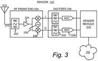 FIG. 3 is a block diagram depicting asensor110 incorporating a software-defined radio receiver in accordance with one or more embodiments presented herein. Anantenna210 may receive aradio frequency signal215. Theradio frequency signal215 may be coupled into a radio frequencyfront end220. The radio frequencyfront end220 may condition theradio frequency signal215 to generate an analog output signal. The analog output signal may comprise in-phase and quadrature components referred to as I and Q signals. The analog output from the radio frequencyfront end220 may be coupled to adigitizer230. The digitizer can output data that is a digital representation of the analog output generated by the radio frequencyfront end220. The digital representation may be sampled in time and quantized in amplitude. The digital representation may also comprise separate I data and Q data. Asensor module310 may receive and process the raw digital representation generated by thedigitizer230. Results of processing associated with thesensor module310 may be communicated onto thenetwork160 for further processing.