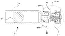 Piercingmember316 may be fixedly engaged with piercingmember retainer314. Shaft314A of piercingmember retainer314 may be inserted throughcentral bore334B ofplate334 and interlock338 may engage piercingmember retainer314 such that biasingmember336 is prevented from decompressing.Introducer member320 may be fixedly connected tointroducer member retainer330. Additionally,sterile boot340 may be connected tointroducer member retainer330.Introducer member retainer330 may be positioned within piercingmember retainer314 such that piercingmember316 is at least partially disposed within lumen320A ofintroducer member320.Connection hub312 may then be connected to plate334 by insertingsnaps312C throughpassages334A. In this position, a portion ofintroducer member320 is disposed withincavity312A andsterile boot340 is engaged withconnection hub312.Second film322 may be placed overaperture312B ofconnection hub312 to definecavity312A. Additionally, during assembly, the fluid conduit may be fluidly connected to piercingmember316. Theinsertion mechanism200 may be assembled and attached to the other end of the fluid conduit. The fluid pathway connection assembly may then be assembled todrug container50. The connection of the fluid pathway connection assembly to the drug container may or may not occur in a clean room or sterile environment. Becausefirst film318 andsecond film322 maintain the aseptic condition ofpierceable seal326 andcavity312A, respectively, the flow path is not exposed to contaminants.