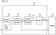 The joint angle commands θ* output frominverse kinematics calculator124 correspond to the joints formed between each of the arm members and between adistal arm16 andthird arm20. Forward differencingcalculator128 receives these joint angle commands θ* and performs forward differencing in order to calculate a corresponding velocity command v* and acceleration command a* for feed forwarding. The velocity command v* and acceleration command a* are output along with joint angle commands θ* tomatrix130 which is used to transform these values into drive unit torque values.Matrix130 can be a table stored in advance inmemory114, for example. The drive unit torque values output frommatrix130 are feed forward torques (FF torques) output toamplifier132. Theamplifier132 also receives the joint angle commands θ* frominverse kinematics calculator124. Theamplifier132 generates commands for each of thedrive units24A-24D based on the joint angle commands θ* frominverse kinematics calculator124 and feed forward torques fromforward differencing calculator128 andmatrix130. Thus, commands can be issued byamplifier132 without the error and oscillation introduced by closed-loop PID control. Closed-loop PID control responds to errors associated with disturbances. The feed forwards serve to cancel such disturbances so that there is reduced position velocity error corrected by the PID loop.
