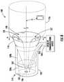 Referring toFIG. 4, cross sectional cut60, magneticfield strength contours62 at an intermediate point along the elongateelectrical conductor18,18′ will now be described. ConicalRF launch structure16,16′ is seen in profile in the center and the elongateelectrical conductor18,18′ is oriented out of the page. Electricallyconductive shield20,20′ is present but not shown for clarity. The contours were obtained by finite element simulation and are for an instant in time without any averaging. As can be seen, the magneticfield strength contours62,62′ are curling to resemble Archimedean spirals so the magnetic flux lines may be Archimedean spirals as well. The spiraling magnetic fields rotate in time about the elongateelectrical conductor18,18′ as the excitation phase advances and the electromagnetic energies propagate.