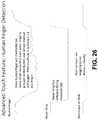 FIG. 26 is a set of charts depicting energy measurement signals associated with a human finger, a water drop, and placing a device on a desk (e.g., placing an object over a sensor). For a human finger, the energy measurement signal inevitably has slight movements or variations, even for the duration of a touch event, which can be detected and identified to confirm that a human finger is initiating the touch event. For a liquid droplet or water droplet, the energy measurement signal has certain characteristics, such as a steep drop followed by a generally steady signal without much variation, if any. Detection of such characteristics can be used to discriminate between an actual intended touch event and accidental contact by other objects, such as falling water. Placing a device or other object on a sensor (e.g., a desk-mounted sensor) can have an energy measurement signal with certain characteristics, such as a relatively shallow drop followed by a generally steady signal without much variation, if any.