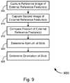 Alternatively and/or additionally,FIG. 9 illustrates amethod900 for determining a change in an azimuth from the communication device of the stick of the excavator. Themethod900 can comprise capturing a reference image of at least one external reference feature (e.g., as shown inFIGS. 4A and 4B) (block905). The external reference features may be in a known and fixed position on the site and can be any of a number of objects (many of which are described above), so long as the external reference features are identifiable by the system in images captured by the image sensor. The excavator may adjust its position (e.g., by rotating, etc.), and at least one additional image of the at least one external reference feature may be captured (block910). The position (e.g., pixel coordinate) of the at least one external reference feature in the reference image may be compared with the position (e.g., pixel coordinate) of the at least one external reference feature in the second image (block915) to determine the azimuth to the stick of the excavator (block920) in the second position/image relative to the original azimuth of the stick in the first image. If the azimuth to the stick in the original position is known (for example, based on compass data, azimuth data input by the user and stored, etc.), the real azimuth to the stick in the second position can be determined, and from that azimuth and the determined reach, the orientation of the stick relative to a local or global coordinate system can be determined (block925), as noted above.
