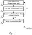 In like fashion,FIG. 11 illustrates amethod1100 of calculating the estimation error of the accelerometer of the communication device. In accordance with themethod1100, first accelerometer data can be captured as described above. In addition, the system might capture additional accelerometer data (block1105). An accelerometer estimation error may be calculated by comparing the determined accelerometer value from the first accelerometer data with the second determined accelerometer value from the second accelerometer data and calculating the error between the two values (block1110).