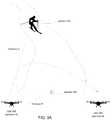 By way of non-limiting example,FIG. 3A illustrates ascene including UAV100, afirst pattern302, andsecond pattern304.First pattern302 and/orsecond pattern304 may be projected (via a remote controller,UAV100, or other device) and/or may be applied to the performer (e.g., the skier) and/or performee (e.g., the ski slope) in another manner (e.g., a sticker, etc.). Pattern recognition component120 (which may be integrated in UAV100) may recognizefirst pattern302 andsecond pattern304. For example,pattern recognition component120 may be configured to analyze visual information captured by image sensor108 (shown inFIG. 1). The captured visual information may include images offirst pattern302 andsecond pattern304.First pattern302 and/orsecond pattern304 may be interpreted as a command and/or request toUAV100 to perform an action or operation related to first pattern302 (e.g.,first pattern302 associated with the skier) and/or second pattern304 (e.g.,second pattern304 associated with a particular location on the ski slope where a particular action or performance may take place).Distance component122 may be configured to determine a first distance (e.g., distance A) betweenUAV100 andfirst pattern302.Distance component122 may be configured to determine a second distance (e.g., distance B) betweenUAV100 andsecond pattern304.UAV100 may be configured to capture visual information (via one ormore sensors108 ofFIG. 1) that includes images and/or a video segment of bothfirst pattern302 andsecond pattern304 in the same field of view. While distance A is larger than a predefined distance,UAV100 may be configured to capture visual information including both the performer and the performee in the same field of view with a wide-angle point of view at an altitude of 20 feet. As distance A becomes shorter (e.g., is a predefined distance) and/or as distance A reaches the length of Distance B, flight control component124 may be configured to adjust the flight controls ofUAV100 such thatUAV100 re-positions from position A to position B and to adjust the sensor controls such thatUAV100 may capture the overlap ofpattern302 andpattern304 on the East side of the ski slope with a high-resolution, slow-motion, close-up video segment in order to capture the action and/or performance (e.g., a jump at the end of the ski slope) atpattern304 when the performer (e.g., the skier) associated withpattern302 collides withpattern304.UAV100 may continue capturing the images and/or video segment asUAV100 travels from position A to position B in order to capture various angles of the performer associated withpattern302 approachingpattern304 during the flight path ofUAV100.