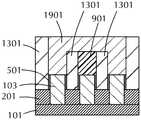 The thirdinsulating layer1301 comprises a third insulating material. The thirdinsulating layer1301 can be any suitable dielectric material as described herein with regard to insulatinglayer102, recessed insulatinglayer201 or second insulatinglayer901. In some embodiments, the third insulatinglayer1301 is the same as one or more of the recessed insulatinglayer201 or the second insulatinglayer901. In some embodiments, the third insulatinglayer1301 is different than the recessed insulatinglayer201 and the second insulatinglayer901.