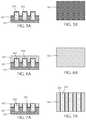 FIGS. 17A and 17B illustrate the electronic device structure ofFIGS. 15A and 15B, respectively, after formingfirst mask1701 andsecond mask1702. Thefirst mask1701 is formed on the top903 of the second insulatinglayer901 and the top1303 of the third insulatinglayer1301 exposed inopening1601 according to some embodiments. Thesecond mask1702 hasopenings1703 through which thefirst mask1701 is exposed. Theopenings1703 are aligned over second insulating layers901. The size of the openings1703 (along the x-axis) can be smaller than, equal to or larger than the thickness of the related second insulating layers901. Thefirst mask1701 and thesecond mask1702 may be the same or different than thefirst mask1501 and thesecond mask1502, respectively.