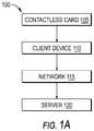 FIG. 1A illustrates a data transmission system according to an example embodiment. As further discussed below,system100 may includecontactless card105,client device110,network115, andserver120. AlthoughFIG. 1A illustrates single instances of the components,system100 may include any number of components.