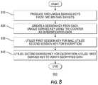 In order to provide additional protection against brute force attacks exposing the keys on the card, it is desirable that theMAC cryptogram955 be enciphered. In some examples, data orcryptogram A955 to be included in the ciphertext may comprise: Random number (8), cryptogram (8). In some examples, the numbers in the brackets may comprise length in bytes. In some examples, the random number may be generated by one or more random number generators which may be configured to ensure, through one or more secure processes, that the random number is unpredictable. The key used to encipher this data may comprise a session key. For example, the session key may comprise DEK-Session-Key940. In theencryption operation941, data orcryptogram A955 and RND are processed using DEK-Session-Key940 to produce encrypted data,cryptogram B960. Thedata955 may be enciphered using 3DES in cipher block chaining mode to ensure that an attacker must run any attacks over all of the ciphertext. As a non-limiting example, other algorithms, such as Advanced Encryption Standard (AES), may be used. In some examples, an initialization vector of 0x‘0000000000000000’ may be used. Any attacker seeking to brute force the key used for enciphering this data will be unable to determine when the correct key has been used, as correctly decrypted data will be indistinguishable from incorrectly decrypted data due to its random appearance.