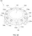 FIGS. 3A and 3B illustrate a top view of a puck andFIG. 3C illustrates a perspective view of a puck. In the illustrated embodiments, apuck104 includes a plurality of “rivets”112a-112i. As discussed previously, rivets112a-112ican include VR or AR specific processing elements such as cameras, light sources, photosensors, projectors, microphones or pick-ups for collecting ambient sound or user voice commands, and/or other I/O devices or sensors now known or hereafter to become known. An example arrangement of VR/AR processing elements in rivets112a-112iis described more fully in connection withFIG. 3H.