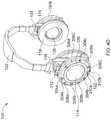 In some embodiments,ear piece portion120 can include aspeaker128 directed inward toward a user's ear.Ear piece portion120 can in turn be connected to afoam ear cushion118 designed to cushion the assembly against the wearer's head. The outer surface ofear piece portion120 is illustrated more fully inFIGS. 2A-I and the accompanying description. In some embodiments,ear piece portion120 may not include additional processing elements and can be used primarily to route communications between the active devices forming other parts of the assembly, such as pucks or components removeably mounted to theheadband102. In alternative embodiments, additional processing elements can be placed withinear piece portion120. For example,ear piece portion120 can be equipped with additional haptic or audio devices to enhance a VR or AR experience (e.g., an electromechanical vibrator or bone-conduction sub-woofer).