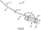 FIG. 8 is a partial top view of asystem800 including atemple812 with an offset according to further examples of the present disclosure. Thesystem800 includes atemple812 of an eyewear frame and an electronic device830 (e.g., camera832). Theelectronic device830 is slidably coupled to thetemple812. Thesystem800 further includes a securing mechanism850 (e.g., bands852-1 and852-2), The securing mechanism is configured to maintainelectronic device830 in engagement with a guide provided on thetemple812. Thetemple812 includes afirst portion814 and asecond portion816. Thesecond portion816 is offset from thefirst portion814 by an offsetdistance821 selected to accommodate thesecuring mechanism850 or portions thereof. For example, the offsetdistance821 may be greater than or equal to adimension823 of the securing mechanism, such as a thickness t of any of the bands852-1 and852-2. In some examples, the thickness t may be about 2 mm or less. In some examples, the bands852-1 and852-2 may have a rounded cross-section (e.g., a circular cross-section). In such examples, the thickness may interchangeably be referred to as a diameter of the cross-section it will be understood that embodiments of the present disclosure may include any combinations of features described with reference to any of the specific examples herein. For example, a temple may be a bifurcated temple as described with reference toFIG. 6 and may also include an offset as described with reference toFIG. 8. Temple according to the present disclosure may include any of the features of temples and/or any of the guides described herein in any combination.