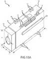 Thecamera10 includes a rail which may be inserted into a groove provided on the temple. In the case of a non-securing groove, thecamera10 may include securing features for engaging with a securing mechanism and thereby maintaining thecamera10 into engagement with the temple. Thecamera10 in the example inFIGS. 13A-13E includes surface features13 configured to engage with a securing mechanism in the form of a stretchable band (not shown in this figure). The surface features13 may be ribs, which may be spaced apart a sufficient distance to accommodate the securing mechanism in the form of a stretchable band there between. Thecamera10 in this example further includesfeatures15 for engaging with attachment features of a shoe (also not shown in this figure). That is, thecamera10 of this example may be coupled to the temple having a groove via therail22 embedded into the camera. In some examples, e.g., if a user wishes to couple thecamera10 to a temple which instead comprises a rail, thecamera10 may be coupled to a shoe which may comprise a groove configured to be received in the rail of the temple, Thecamera10 of this particular example is operable to be coupled to any number of temples comprising a variety and/or types of rails or tracks.